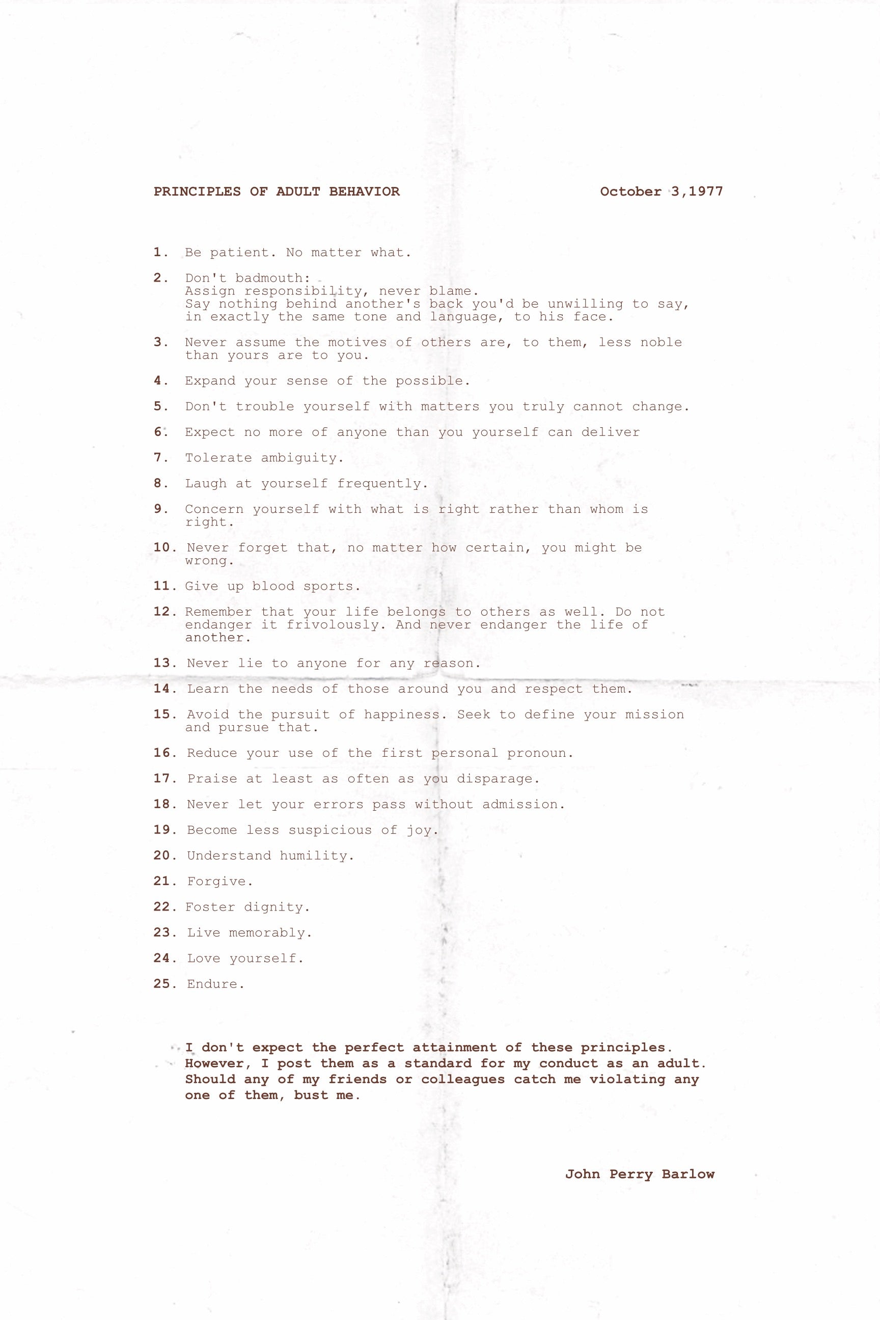 A compiled list of 25 guidelines for living a life of integrity by John Perry Barlow.